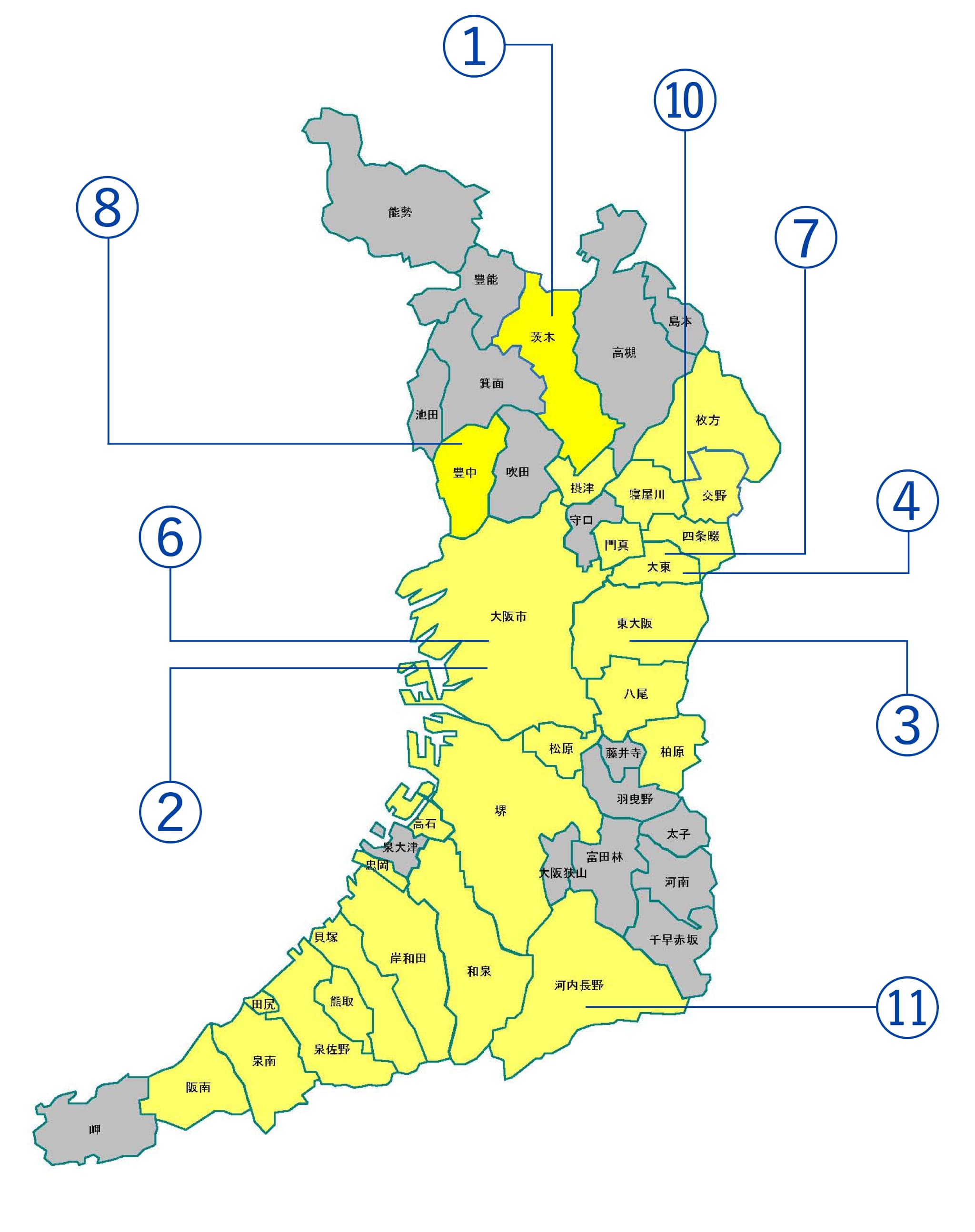 - 八尾市、堺市、門真市、東大阪市、大阪市(平野区・都島区・生野区)、柏原市、和泉市、高石市、四条畷市、大東市、摂津市、松原市、三重県名張市など15エリア