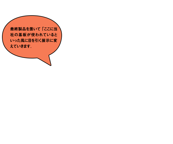 現在は製品を展示して機能を伝えているだけですが、今後は最終製品と並べて、「ここに当社の基板が使われている」ことを明らかにしていこうと考えています、最終製品のなかでどのような役割を果たしているかを見せていくことで製品をより身近に感じてもらい、多くの人のアンテナにも引っかかるような展示に変えていきます。