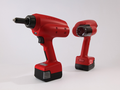ロブテックスの主力商品のひとつがリベッターで、昨年12月にはエアーリベッターの、今年9月にはコードレスリベッターの新製品を発売した。最新式エアーリベッターの形状は1960年代に発売した商品とほとんど同じだが、当時に比べて軽量化はもちろん動力もエア(圧縮空気)から電気、さらには電池式へと進化するなど、機能は時代を経て格段に進化している。